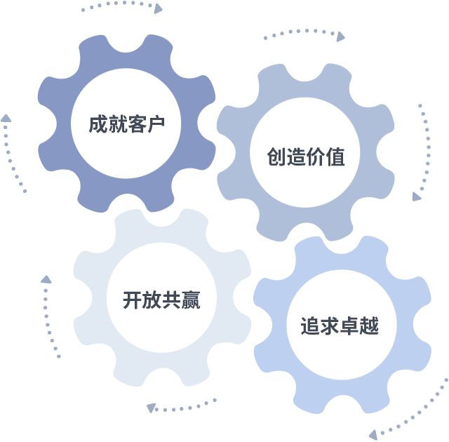 成就客户是一切决策的出发点,创造价值是衡量所有工作的标准,追求卓越是金沙9001cc 以诚为本做事做人的态度,开放共赢是金沙9001cc 以诚为本的格局也是最终的结果。价值观的齿轮环环相扣,推动着组织里的每个人不断向前。